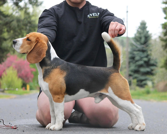 Retro is the first boy to join our beagle pack! He is very easy going, and gets along well with each of the girls. His favorite thing in the world is a long cuddle session. Retro is as smart as he is sweet though, and he catches onto training extremely fast. He finished his AKC CH just before a year old and we look forward to his show career as a special after he matures. Retro wickets in at 14.5".